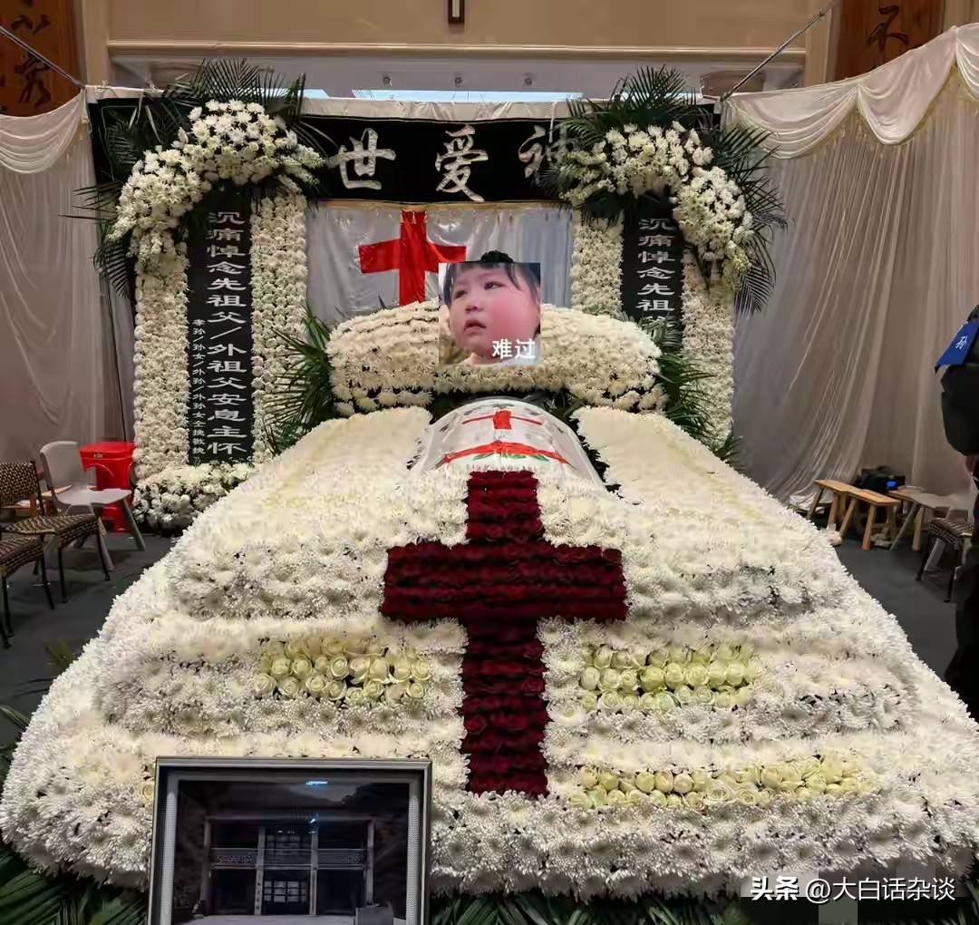 第四张图是灵堂内画面,老爷子整个遗体用白色鲜花包围,“十”字架元素十分显眼。